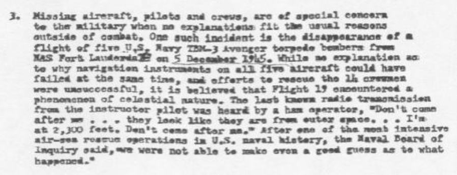 Missing aircraft, pilots and crews are of special concern to the military when no explanations fit the usual reasons outside of combat. One such incident is the disappearance of a flight of five U.S. Navy TBM-3 Avenger torpedo bombers from NAS Fort Lauderdale on 5 December 1945. While no explanation as to why navigation instruments on all five aircraft could have failed at the same time, and efforts to rescue the 14 crewmen were unsuccessful, it is believed that Flight 19 encountered a phenomenon of celestial nature. The last known radio transmission from the instructor pilot was heard by a ham operator,