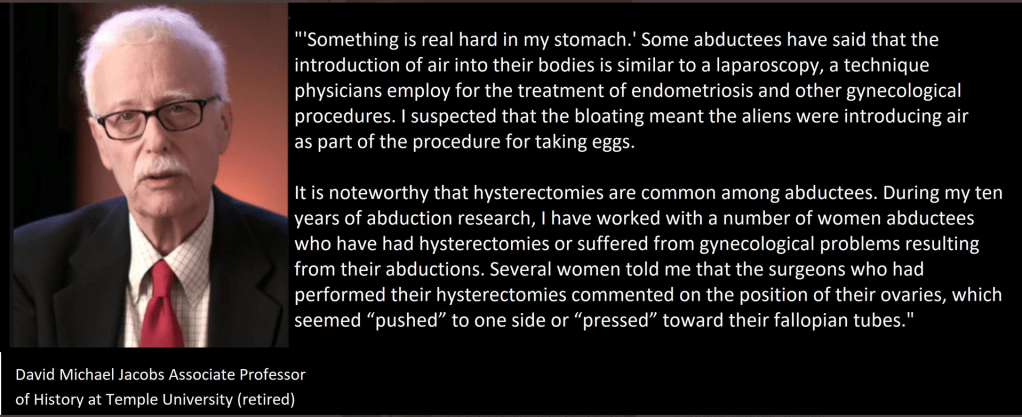 Professor Dr. David Michael Jacobs has authored many books concerning alien abuduction. He has interviewed hundreds of people from around the world who have memories of being abducted by aliens — and in case after case, the details are uncannily similar.