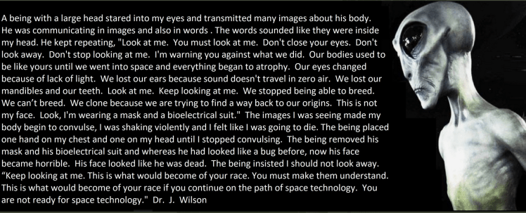 During one of Karin’s experiences a being removed his mask and “biomechanical suit” and told her, “You must make them understand.” Without his mask and biomechanical suit, the entity changed before her eyes and whereas he had looked “like a bug” before, now his face became horrible. “His face looks like he’s dead. It looks like he’s been rotting.”